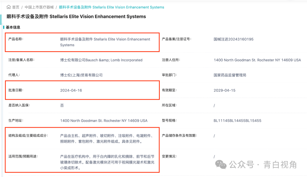 2024年4月18日,国家药品监督管理局正式批准了博士伦新型超乳玻切一体机Stellaris Elite Vision Enhancement Systems中国上市,注册证号:国械注进20243160195。适用范围:产品在医疗机构中,用于白内障的乳化和摘除、前节和后节玻璃体切除术。配备激光模块还可用于视网膜光凝术和激光小梁成形术。