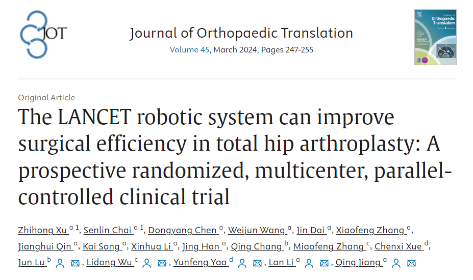 近期,由南京大学医学院附属鼓楼医院运动医学与成人重建外科蒋青、徐志宏教授牵头,东南大学附属中大医院,浙江大学医学院附属第二医院、安徽医科大学第二附属医院和杭州柳叶刀机器人有限公司、南京西格玛医学技术股份有限公司共同研究的成果发表在骨科转化医学相关的国际顶级期刊《Journal of Orthopaedic Translation》(IF=6.6,JCR Q1,中科院1区TOP期刊)。本研究进行了一项前瞻性、随机、多中心的全髋关节置换术临床平行对照试验,验证了柳叶刀髋关节置换手术机器人系统在辅助医生进行全髋关节置换手术时具有更高的准确性和安全性,揭示了髋关节置换手术机器人系统在临床应用的安全性及未来发展潜能。