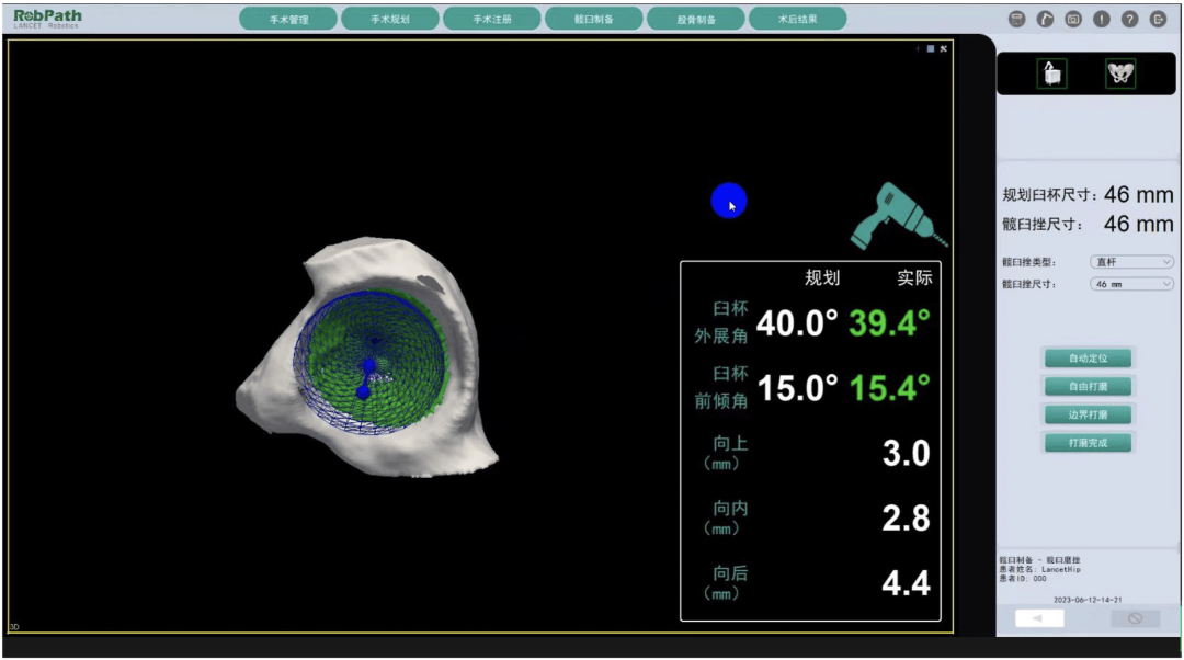 2、常规手术髋臼信息的获取和锉削深度是基于外科医生的经验和习惯,柳叶刀机器人系统将这两个步骤都变得可视化和标准化,大大提高了髋臼假体拟合的准确性,并且在超过规划区域时自动停止,避免髋臼过度损伤。