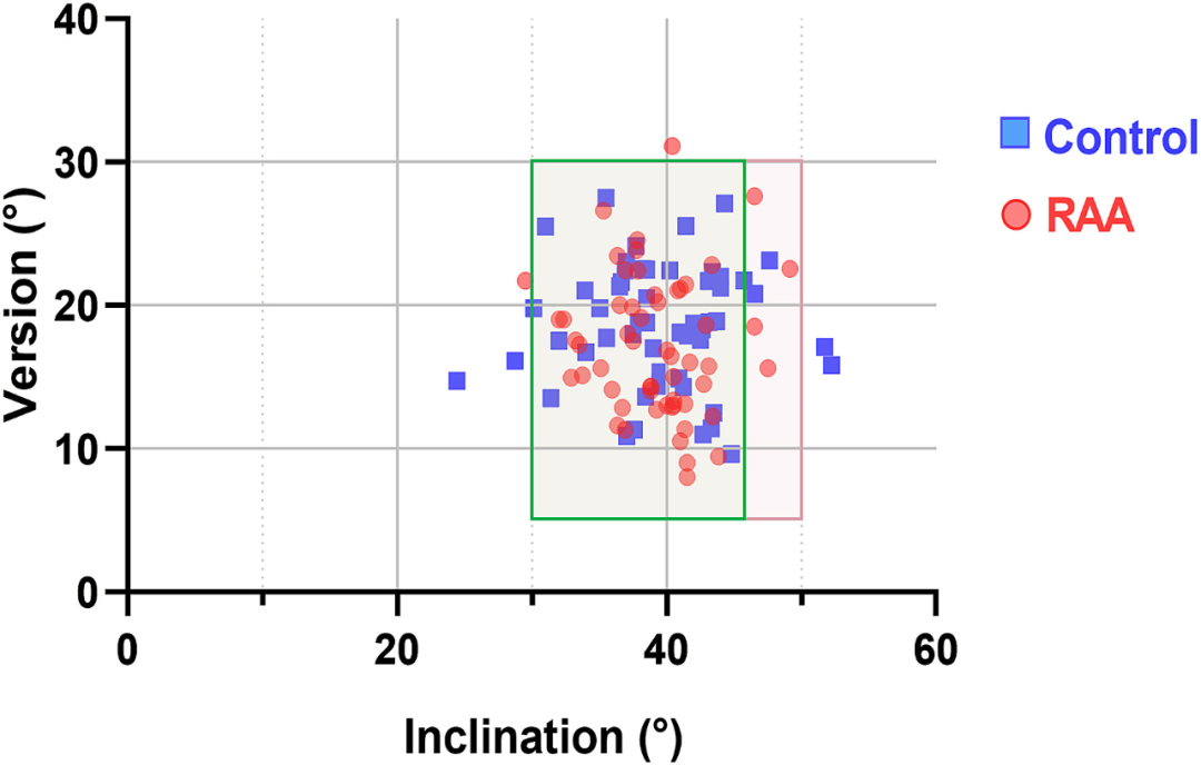 对照组Lewinnek安全区和Callanan安全区分别为47例(85.5%)和44例(80.0%)。RAA组52例(92.9%)和49例(87.5%)患者位于Lewinnek安全区和Callanan安全区。