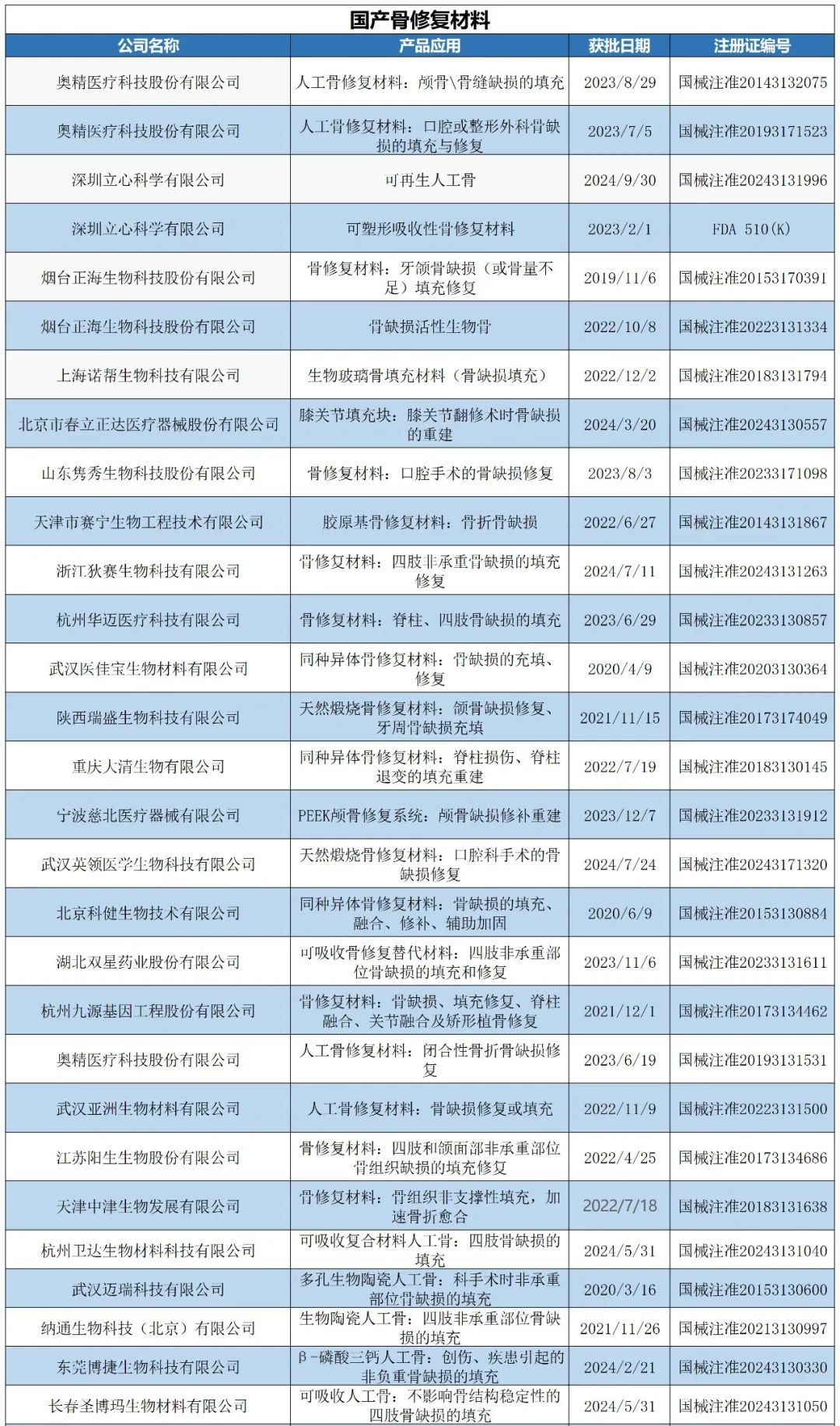 品名举例:人工骨、骨修复材料、羟基磷灰石生物陶瓷、磷酸钙生物陶瓷、β-磷酸三钙人工骨、硫酸钙人工骨、钙磷盐骨水泥、生物玻璃骨填充材料。