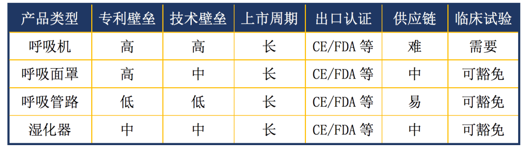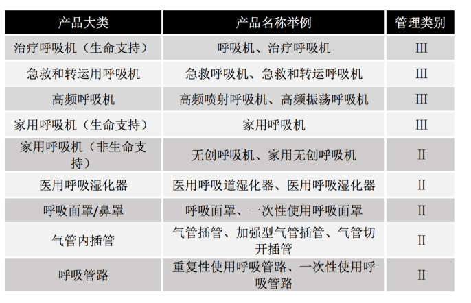 第Ⅱ、Ⅲ类医疗器械需要注册审批,呼吸机以及附件产品上市前需要取得《医疗器械注册证》和《医疗器械生产许可证》。审批周期为10-12个月(第Ⅱ类)或12-15个月(第Ⅲ类),参考表2。其中呼吸机类产品不在临床试验豁免目录里,还需进行临床试验。