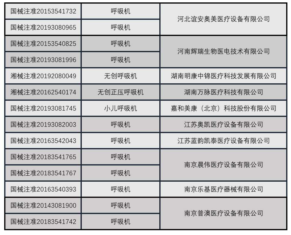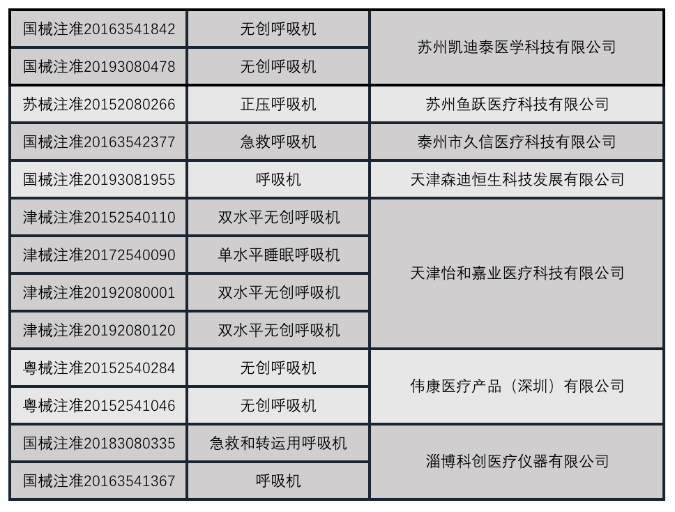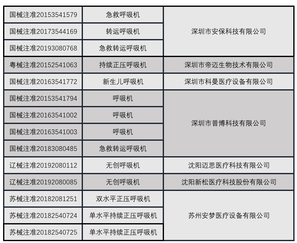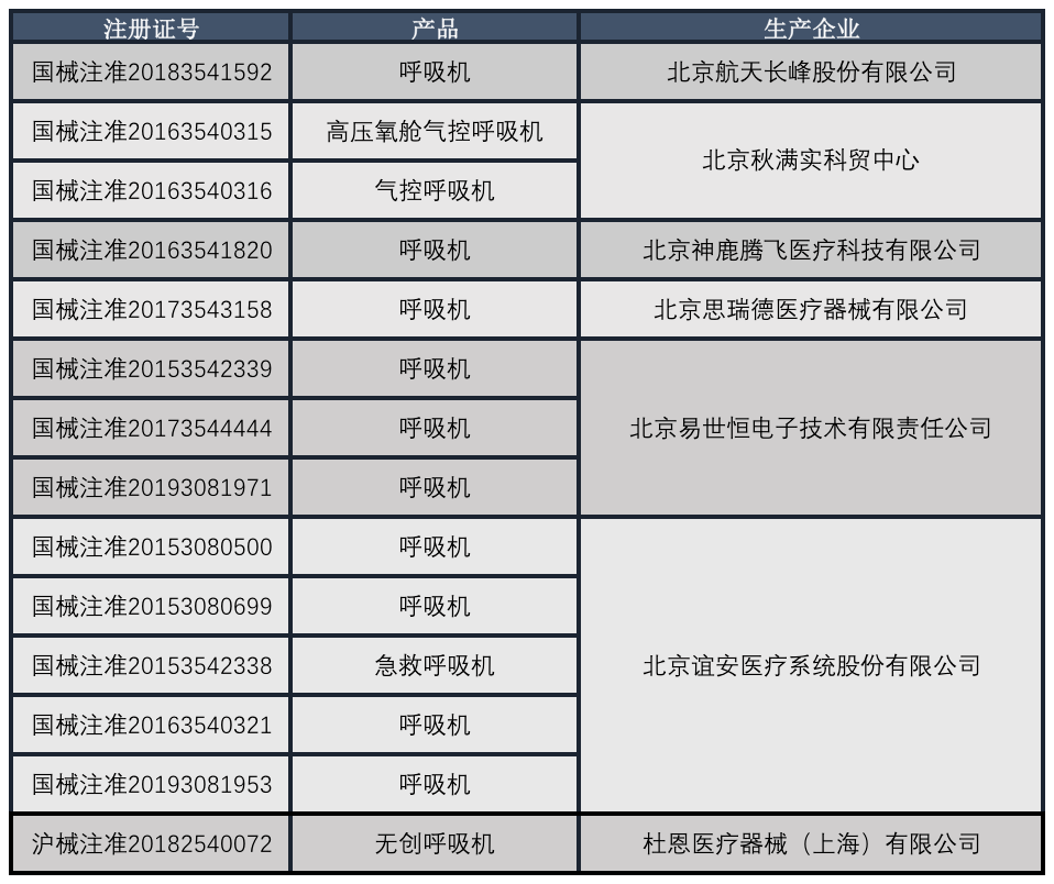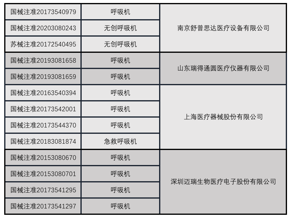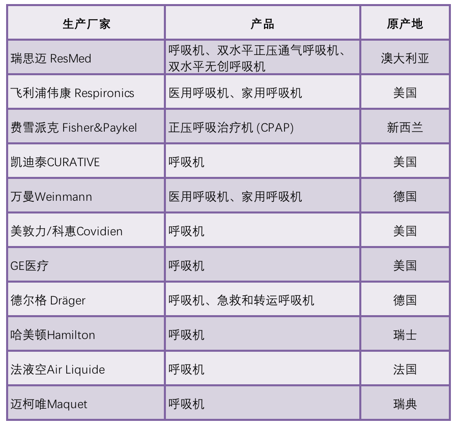 4) 随着中国市场的需求增大,欧美主要的呼吸机厂家悉数进入中国,同时国内厂家也在快速发展,在占领中低端市场的同时,也在积极研发中高端产品。已取得国内产品注册证的呼吸机厂家。