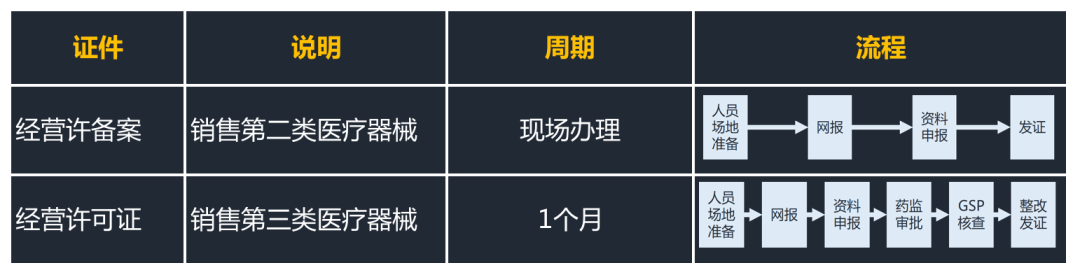 4) 销售呼吸机类产品的企业需要办理医疗器械经营许可证、医疗器械经营备案证,受理单位为市级药监部门,流程见表7。