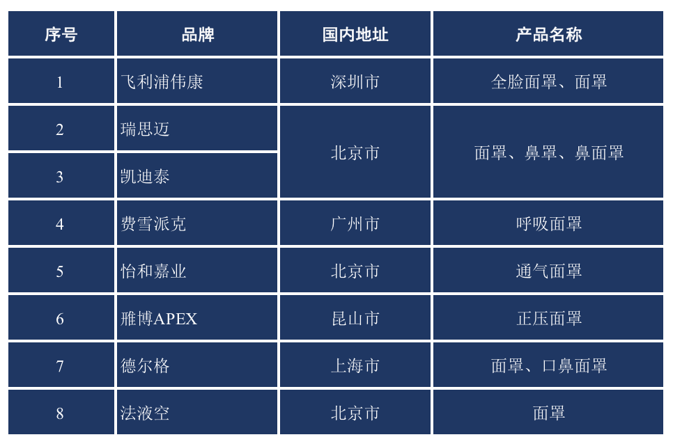 5) 呼吸面罩为呼吸机的主要附件,其在国内的主要生产厂家。