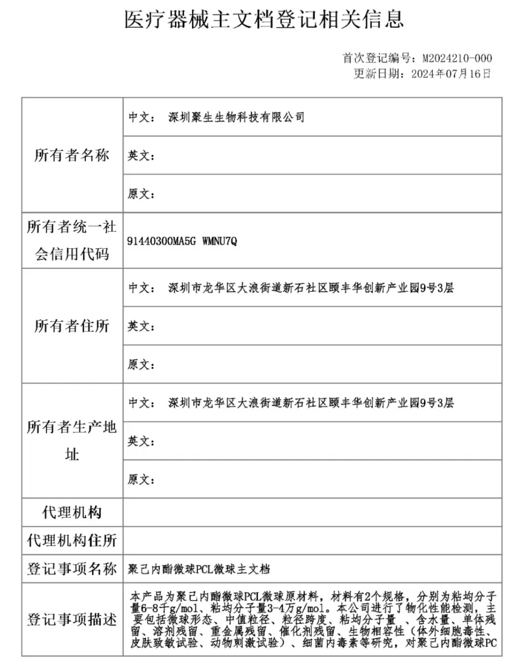 近日,据国家药监局信息显示,深圳聚生生物科技有限公司(以下简称“深圳聚生”)聚己内酯微球PCL微球于2024年7月16日成功通过了国家药监局医疗器械主文档登记,主文档登记号为M2024210-000。